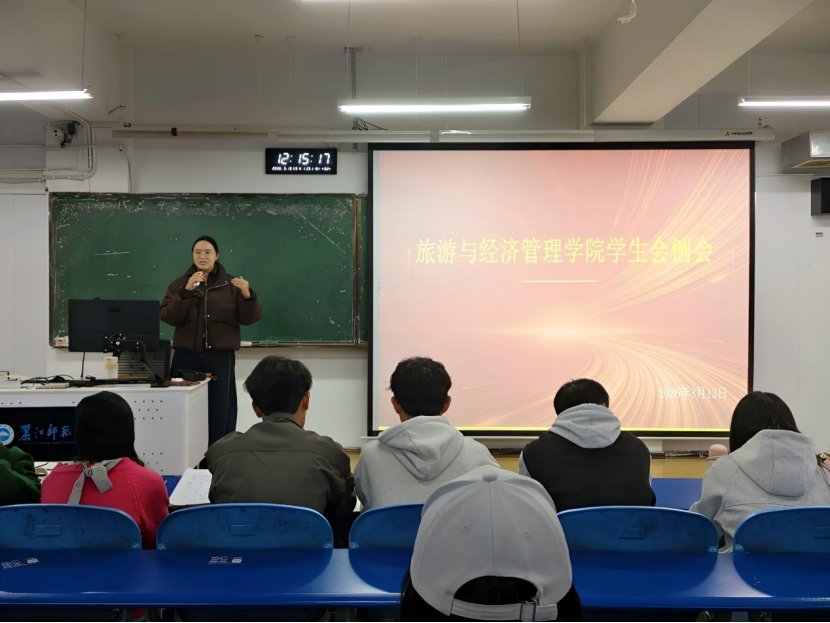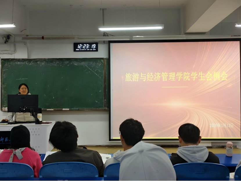 2026年3月13日中午,旅游与经济管理学院团总支学生会本学期第一次工作例会在博学楼222教室召开。学院团总支书记张寿香老师莅临指导,学生会全体成员参加会议,会议由主席团成员方远蓉主持。