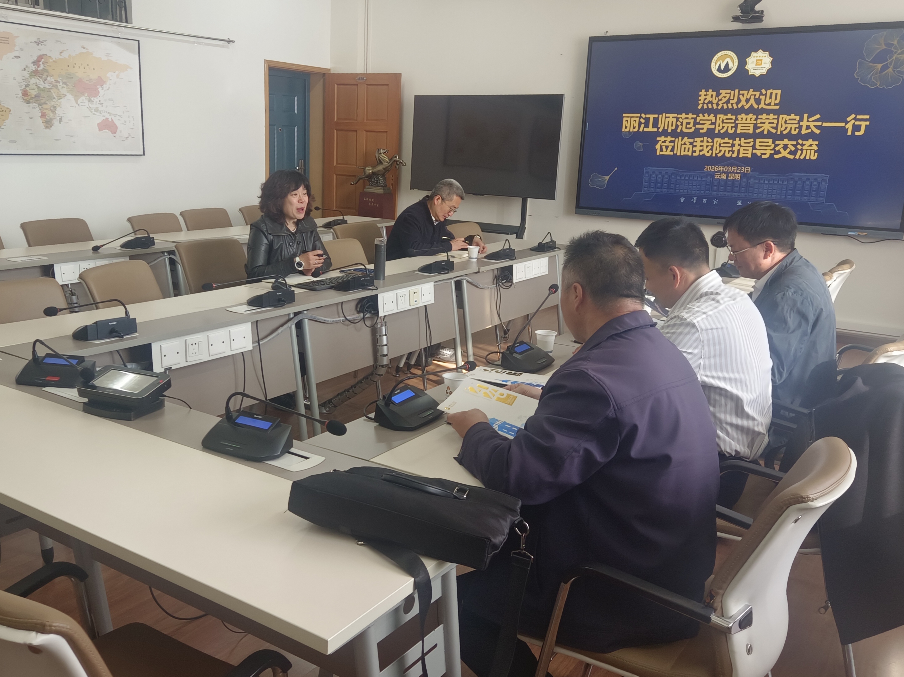 为深入推进专业内涵建设与实验实训条件提质升级,学习借鉴省内一流高校先进经验,2026 年 3 月 23 日上午 9 点,丽江师范学院旅游与经济管理学院院长普荣带队,学院副院长杨静海、财经教研室主任李章红、酒店管理与数字化运营专业负责人杨永鹤一行,前往云南大学工商管理与旅游管理学院开展专题交流学习。